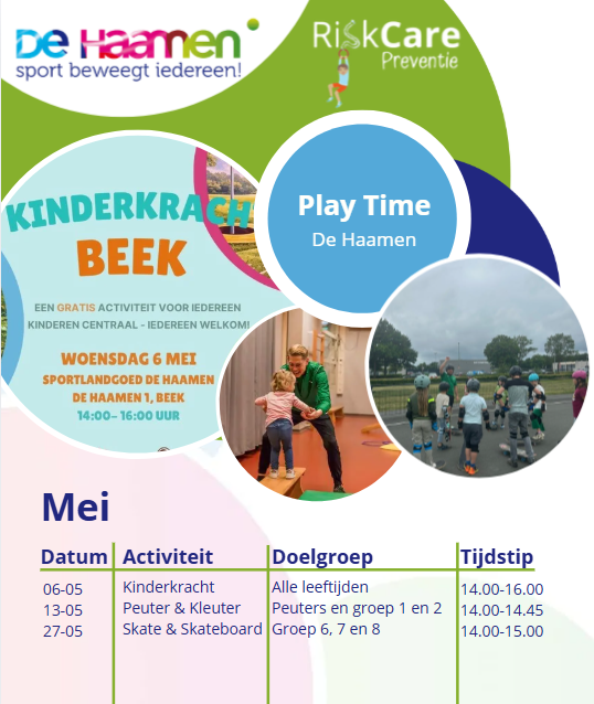 Bij De Haamen organiseren wij iedere woensdag in samenwerking met RiskCare Preventie uitdagende gymlessen en clinics voor de jeugd. Maandelijks varieert het beweegaanbod waarbij Peuter & Kleuter Gym als vast onderdeel terug zal keren met iedere maand een ander thema hieraan gekoppeld. Onze gezamenlijke doelstelling is de jeugd structureel op een gevarieerde, plezierige en uitdagende manier te laten bewegen.
