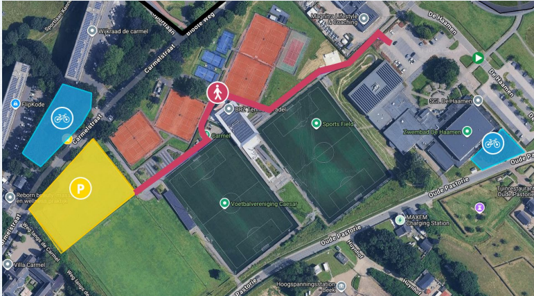 Op 11 en 12 oktober 2025 is de start van het WK Gravel bij Sportlandgoed De Haamen. Daarom zijn van donderdag 9 oktober t/m zondag 12 oktober de reguliere parkeerterreinen rondom ons Sportlandgoed gesloten. Moet je in deze periode bij De Haamen zijn, kom dan bij voorkeur met de fiets of het Openbaar Vervoer. Zo vermijd je files en parkeerdrukte. Wil je alsnog met de auto komen, vraag dan een parkeerkaart aan voor het parkeerveld aan de Carmelstraat. Dit kan door middel van het sturen van een email aan: verhuur@dehaamen.nl vermeld in uw mail uw naam, telefoonnummer en kenteken van de betreffende auto. Uw aanvraag nemen wij vervolgens in behandeling en na goedkeuring delen wij uw gepersonaliseerde parkeerkaart. De locatie van de fietsenstallingen en het parkeerveld zijn te vinden in onderstaande afbeelding. Eenmaal geparkeerd kunt u onderstaande looproute volgen.