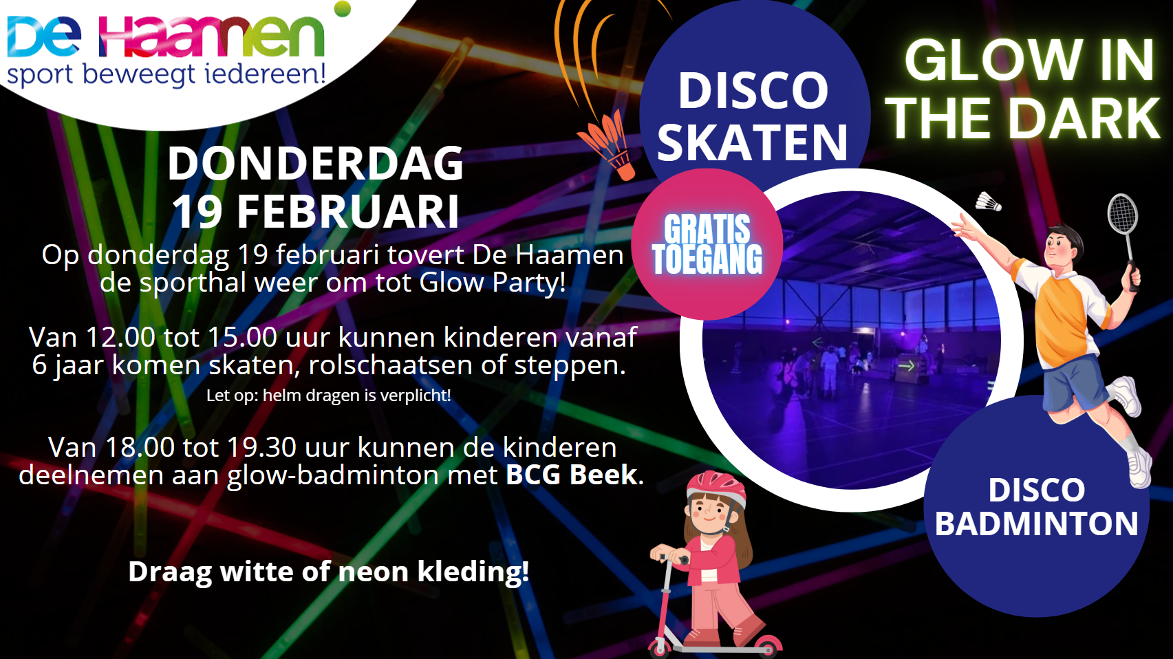 Op donderdag 19 februari organiseert De Haamen de tweede editie Glow in the Dark Discoskaten! Op deze dag zal onze sporthal omgetoverd worden tot een Glow Party op rolletjes.