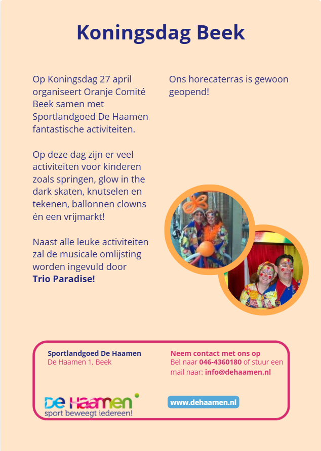 Ook dit jaar slaan Sportlandgoed De Haamen en het Oranje Comité Beek weer de handen ineen om er samen een fantastische Koningsdag van te maken!