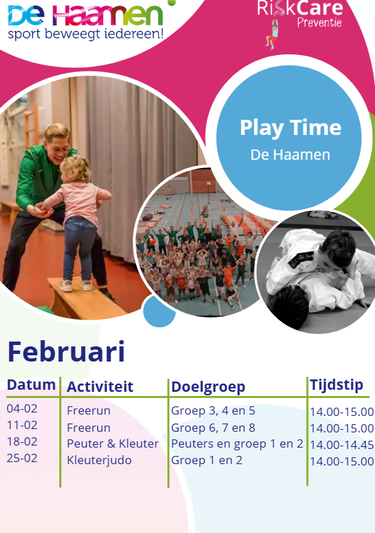 Bij De Haamen organiseren wij iedere woensdag in samenwerking met RiskCare Preventie uitdagende gymlessen en clinics voor de jeugd. Maandelijks varieert het beweegaanbod waarbij Peuter & Kleuter Gym als vast onderdeel terug zal keren met iedere maand een ander thema hieraan gekoppeld. Onze gezamenlijke doelstelling is de jeugd structureel op een gevarieerde, plezierige en uitdagende manier te laten bewegen.