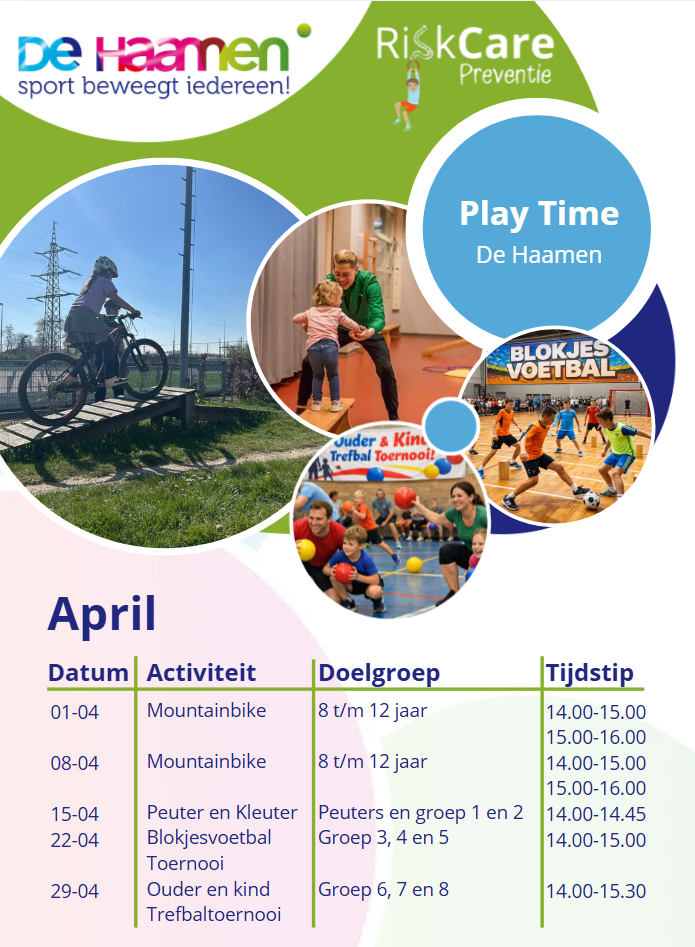 Bij De Haamen organiseren wij iedere woensdag in samenwerking met RiskCare Preventie uitdagende gymlessen en clinics voor de jeugd. Maandelijks varieert het beweegaanbod waarbij Peuter & Kleuter Gym als vast onderdeel terug zal keren met iedere maand een ander thema hieraan gekoppeld. Onze gezamenlijke doelstelling is de jeugd structureel op een gevarieerde, plezierige en uitdagende manier te laten bewegen.